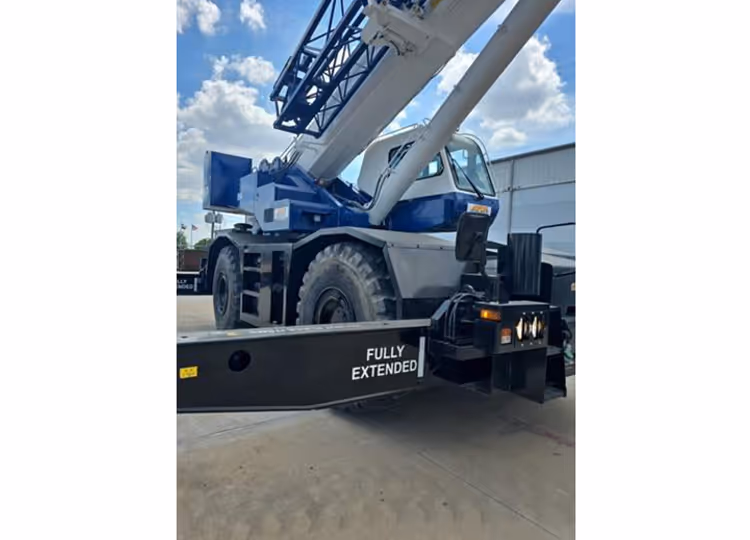 2009 Tadano GR800XL-1 Rough Terrain Crane; Boom: Five section full power synchronized telescoping boom, 37.7'~144.4', of hexagonal box construction with 7 sheaves; Jib: two stage bi-fold lattice type with 3.5, 25, or 45 degree offset (tilt type); single sheave, at the head of both jib sections; stored alongside base boom section; jib length is 32.5' or 58.1'; assist cylinders for mounting and stowing; Mitsubishi 6M60-TLA3B 267 hp diesel engine; full automatic transmission; 6 forward and 2 reverse speeds, constant mesh: 3 speeds - high range - 2 wheel drive; 4 wheel drive; 3 speeds - low range - 4 wheel drive; Travel Speed: 25 mph; Axle: front: full floating type, steering and driving; Rear: full floating type, steering and driving and non-spin rear differential; four steering nodes available: 2 wheel front, 2 wheel rear, 4 wheel coordinated and 4 wheel crab; Cab and Controls: left side, steel construction with sliding door; door window is powered control; tilt-telescoping steering wheel; adjustable control lever stands; 3-way adjustable operator's seat; hot water cab heater; air conditioning; Tadano electronic Load Moment Indicator system (AML-L): control lever lockout function; driving axle 2-way selected type by manual switch, 4x2 front drive, 4x4 front and rear drive.